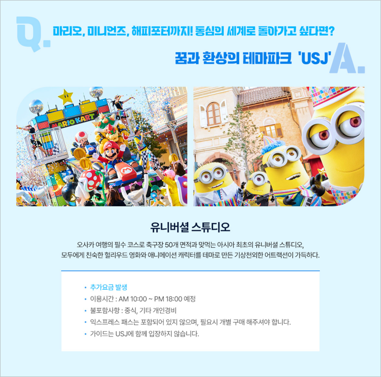 ※ 2일차 유니버셜스튜디오 선택시, 추가요금 1인 70,000원 추가요금 발생합니다.