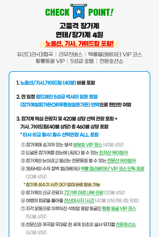 인천 국제 공항 출발 → 연태 도착 → 연태 출발 → 장가계 도착 → 가이드 미팅 → [관광] 백장협(차창), 황룡동굴 VIP코스 → 호텔 투숙 및 휴식