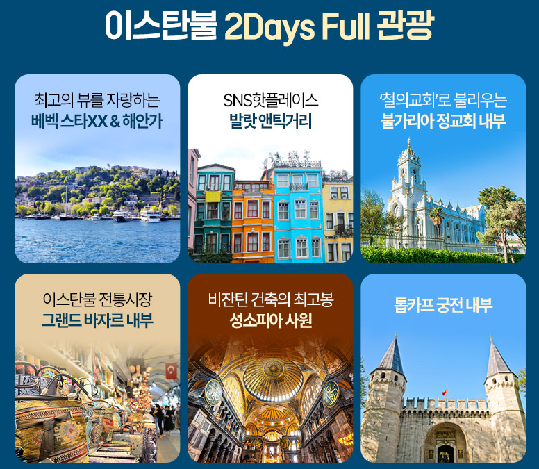 호텔조식 후 → 이스탄불 관광(베벡 해안가, 그랜드 바자르, 보스포러스해협 크루즈 등) → 호텔 투숙 및 휴식