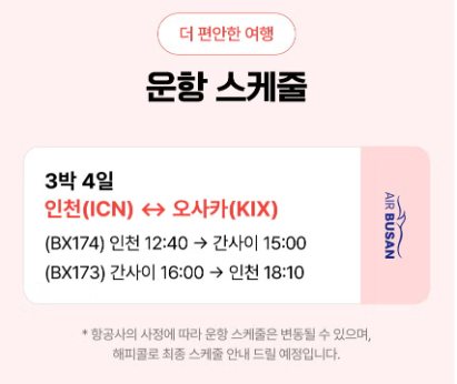 출발 BX174 인천 국제공항 출발 12:40 - 간사이 국제공항 15:00 도착