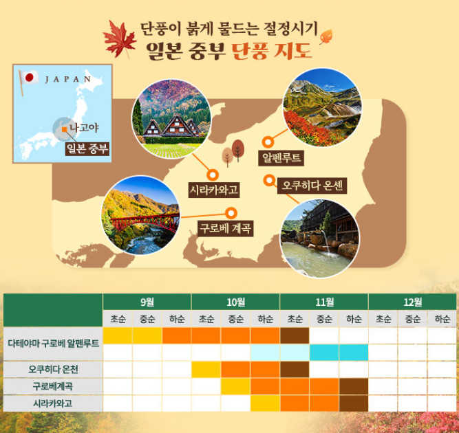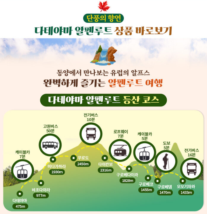호텔 조식 후 → 오오기사와 이동 → [관광] 북 알프스 단풍(나가노현 오오기사와 역-다테야마역을 교통수단으로 이동하는 ROUTE) → 호텔 체크인 후 석식 및 휴식
