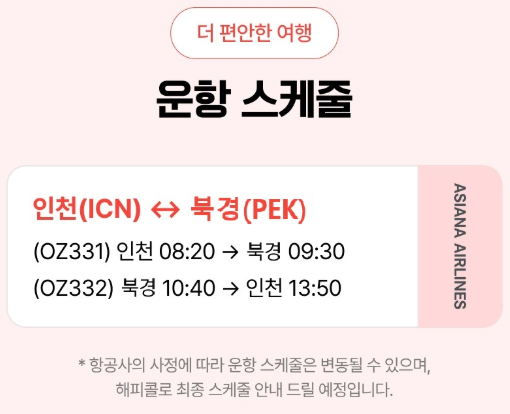 인천출발 OZ331 08:20/09:30 북경도착 (비행시간 : 02시간 10분)