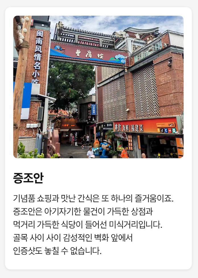 - 아기자기한 기념품을 파는 가게와 먹거리 가득한 식당이 늘어선 미식거리 증조안