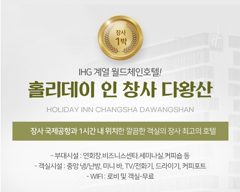 ② 장사 : 홀리데이 인 창사 다왕산 HOLIDAY INN CHANGSHA DAWANGSHAN 또는 동급
