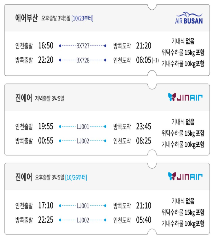 [에어부산] 오후출발 3박5일 BX747 인천-방콕 17:15-21:20 BX748 방콕-인천 22:20-06:05(+1) 기내식없음/위탁수하물15KG포함/기내수하물10KG포함