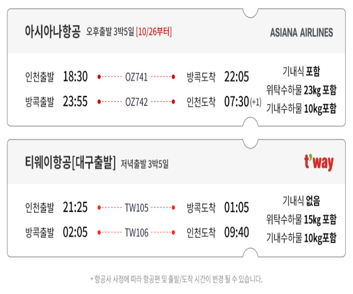 [티웨이항공] 저녁출발 3박5일 TW101 인천-방콕 18:00-22:35 TW102 방콕-인천 00:05-07:40 기내식없음/위탁수하물15KG포함/기내수하물10KG포함