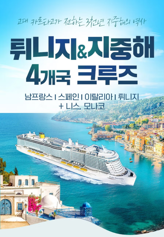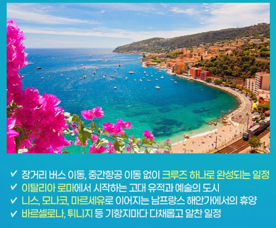 튀니지+유럽 4국 크루즈 11일 #남프랑스/모나코/이탈리아/스페인/튀니지 #초대형 코스타 크루즈+대한항공 #선착순 발코니 업그레이드