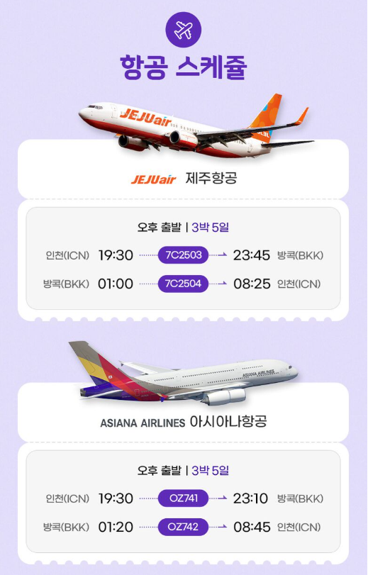 OZ0741 인천국제공항(ICN) 출발 19:30 - 방콕국제공항(BKK) 도착 23:10