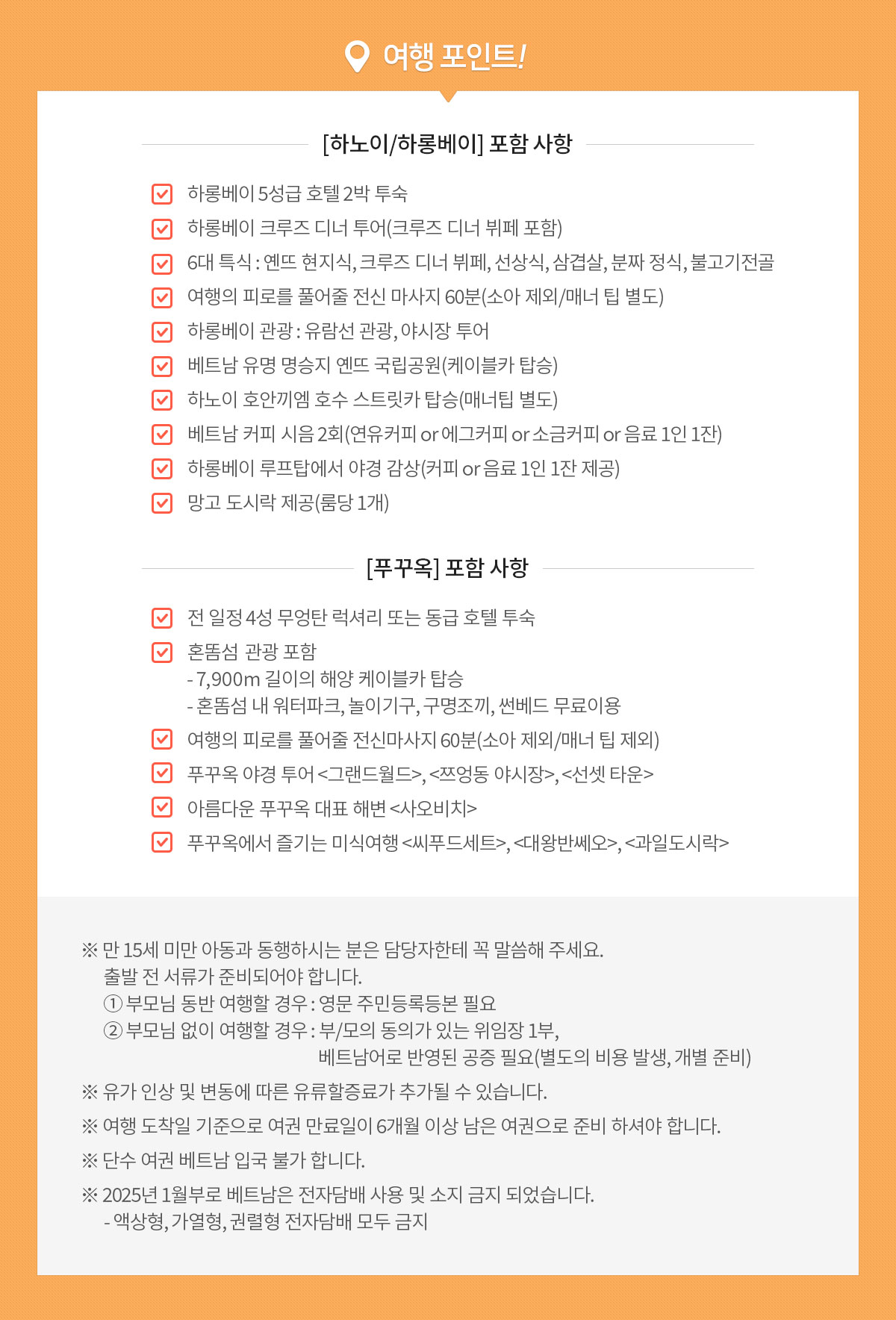 √ 6대특식 및 전일정 식사 : 옌뜨현지식 / 크루즈 뷔페 / 선상식 / 삼겹살 / 분짜정식 / 불고기전골)