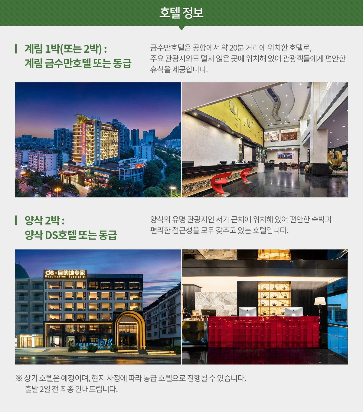 - 계림 2박 : 계림 금수만호텔 또는 동급 (출발 2~3일 전 안내 예정)