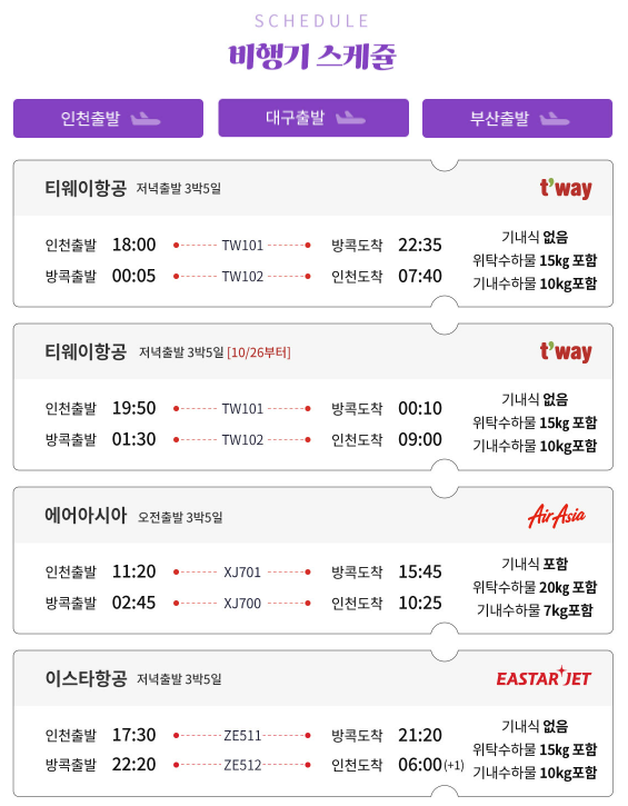 [티웨이항공] 저녁출발 3박5일 TW101 인천-방콕 18:00-22:35 TW102 방콕-인천 00:05-07:40 기내식없음/위탁수하물15KG포함/기내수하물10KG포함