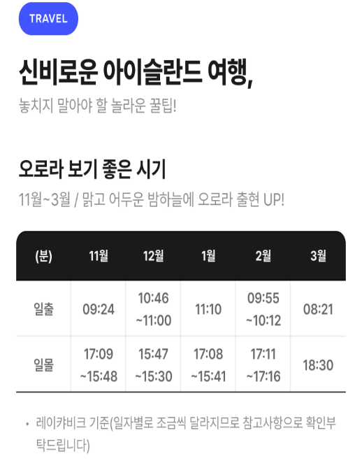 ※오로라 헌팅투어는 약 2~3시간정도 진행되며 현지 사정에 의해 변동될 수 있습니다. (눈이 올 경우 관측지수가 높더라도 못 볼 수있습니다.)