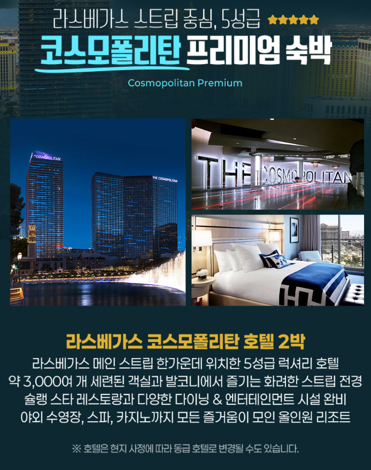 - 라스베가스 : COSMOPOLITAN LAS VEGAS HOTEL 또는 동급 (5성급)