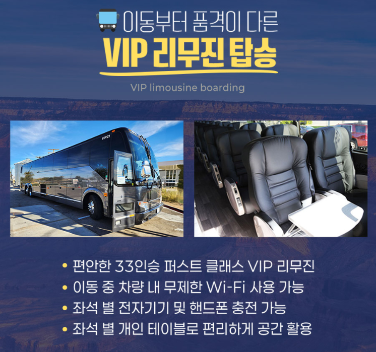└ VIP 리무진 버스 이용으로 장시간 이동도 편안하게!