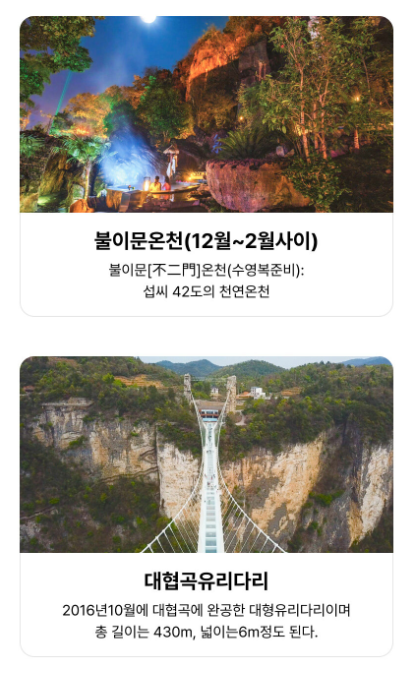 호텔 조식 후 → [관광] 칠성산(케이블카왕복), 유리잔도, 불이문온천(12월~2월출발시), 부용진 폭포마을 및 야경 → 호텔 투숙 및 휴식