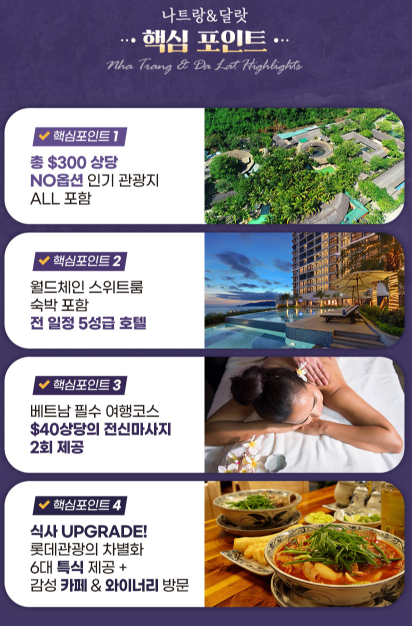 ▣ 아름답고 황홀한 나트랑 달랏 여행! NO 옵션으로 편안하게, 총 $300 상당의 핵심특전 제공