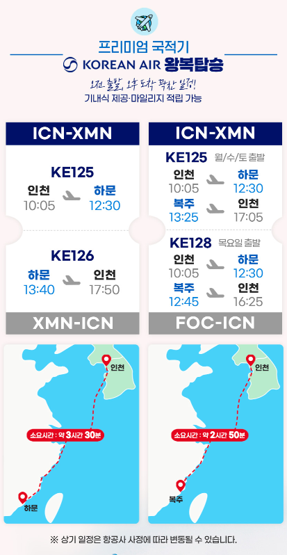 KE125편 10:05 인천 출발 - 12:30 하문 도착 / KE128편 12:45 복주 출발 - 16:25 인천 도착