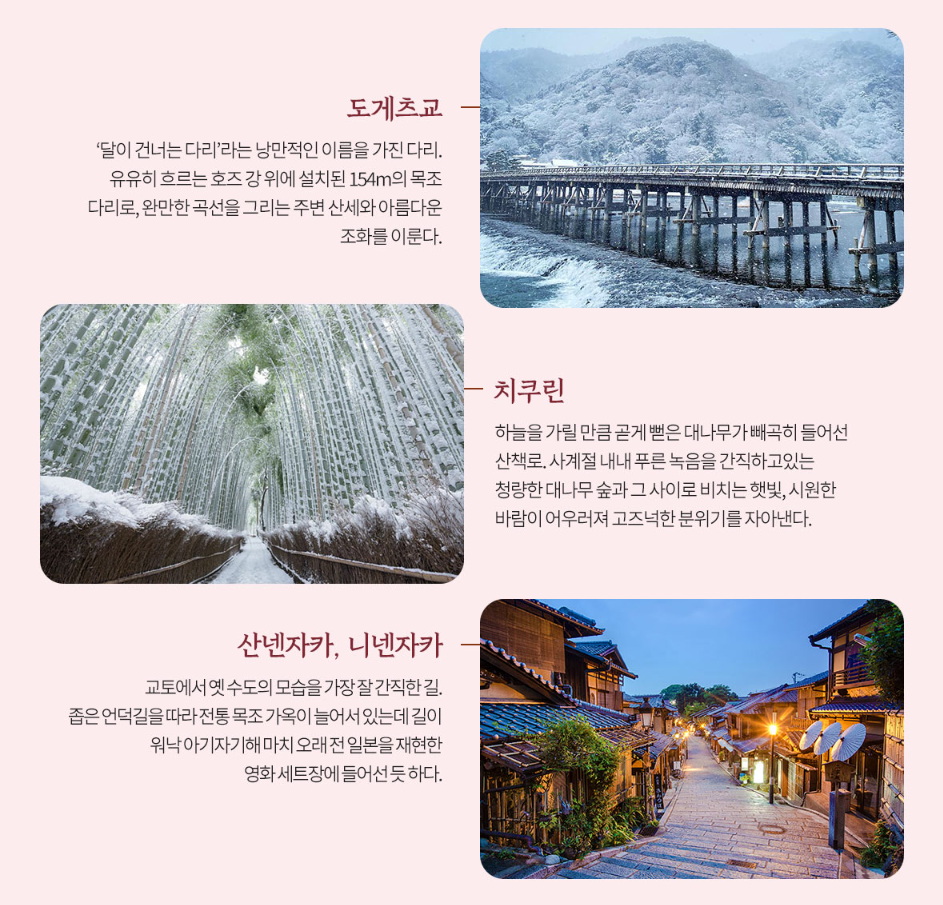- 교토 : 절벽 위에 세워진 독특한 구조의 사찰 '청수사', 일본 전통가옥이 가득한 '니넨자카&산넨자카', 교토의 부엌 '니시키 시장'