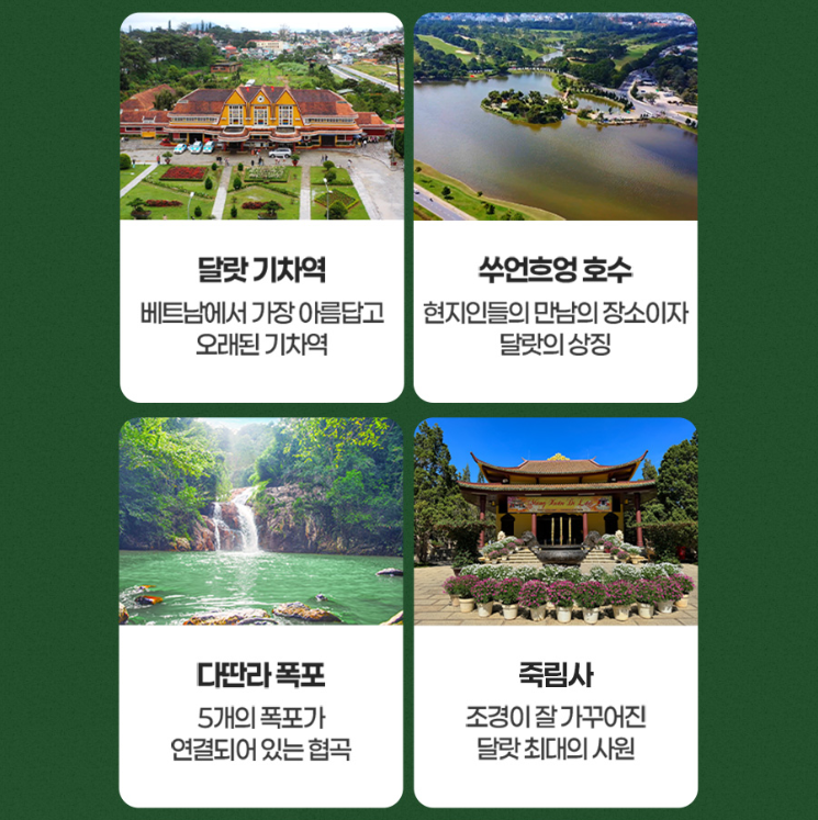 - 4일차 : 조식 후 체크아웃 - 쇼핑센터 방문(3회) - 중식 - 린푸억 사원 - 나트랑 이동 - 나트랑 대성당(차창) - 롱선사 - 석식 - 카페 힐링타임(CCCP) - 공항으로 이동