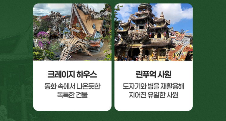 - 3일차 : 조식 후 가이드 미팅 - 죽림사 - 다딴라 폭포 - 중식 후 - 크레이지 하우스 - 랑비앙마운틴 짚차&전망대 - 석식 - 달랏 야시장 - 호텔 투숙 및 휴식