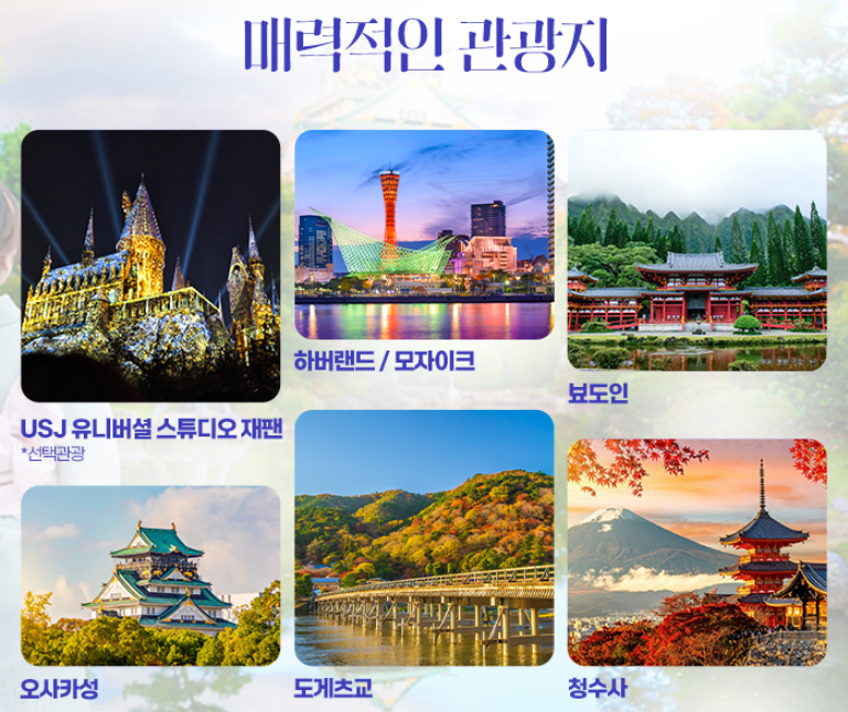 ■ 선택관광 : (1회) 1) 오사카 유니버셜 스튜디오 재팬 (USJ) : 80,000원 (1인/성인,소아 동일) 이용 예정 시간 : AM 10:00 ~ PM 18:00 포함 사항 : 전일 자유이용권, 왕복 송영 불포함 사항 : 유니버셜 內 중식 불포함