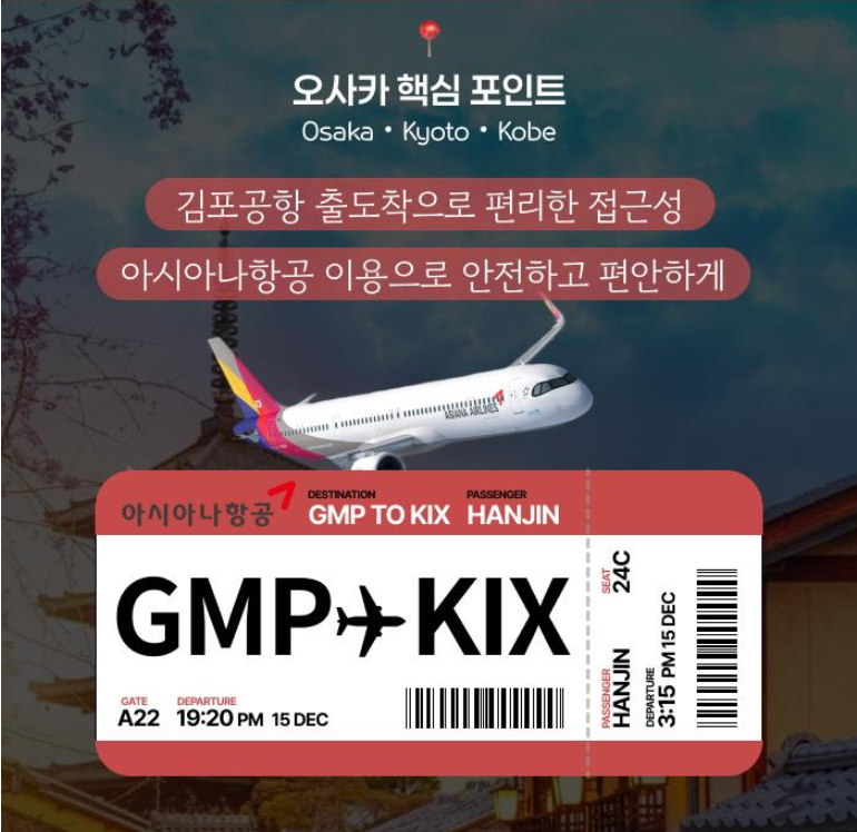1) (항공) 프리미엄 국적기 아시아나 김포出-간사이공항 직항 왕복 탑승 (마일리지 왕복 약 840점 적립 / 성인기준)