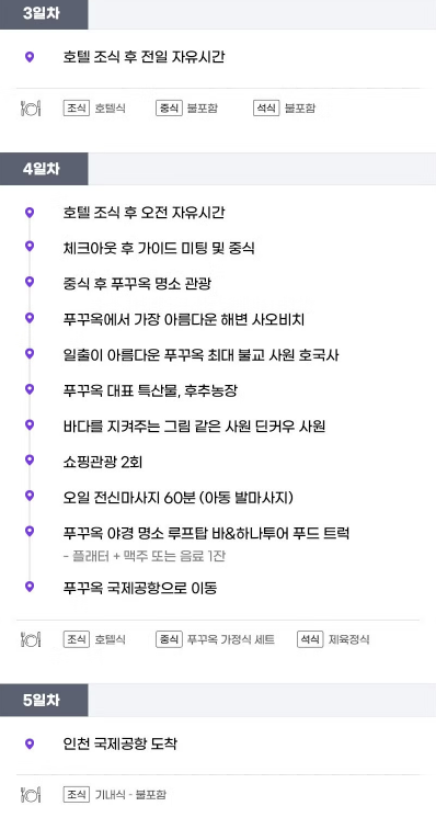 조식 (호텔식) 오전 자유시간 후 체크 아웃 및 가이드 미팅 중식 (푸꾸옥 가정식 세트) 푸꾸옥에서 가장 아름다운 해변 사오비치 일출이 아름다운 푸꾸옥 최대 불교 사원 호국사 푸꾸옥 대표 특산물, 후추농장 바다를 지켜주는 그림 같은 사원 딘커우 사원 쇼핑 2회 석식 (제육정식) 오일 전신마사지 60분(성인한정, 아동 발마사지) 푸꾸옥 야경 명소 루프탑 바&푸드 트럭(꼬치구이+감자튀김+맥주 또는 음료1잔) 푸꾸옥 국제공항으로 이동