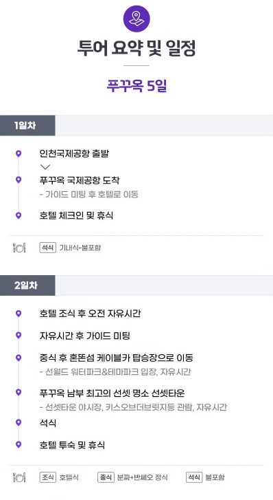 식사 조식 : 호텔식 / 중식 : [특식] 푸꾸옥 가정식 세트 / 석식 : [특식] 제육 정식