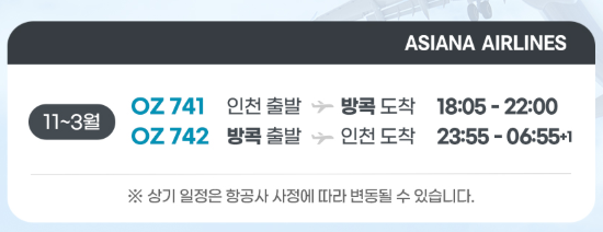 [OZ 742] 23:55 방콕출발 - 06:55+1 인천도착 (약 5시간 소요)
