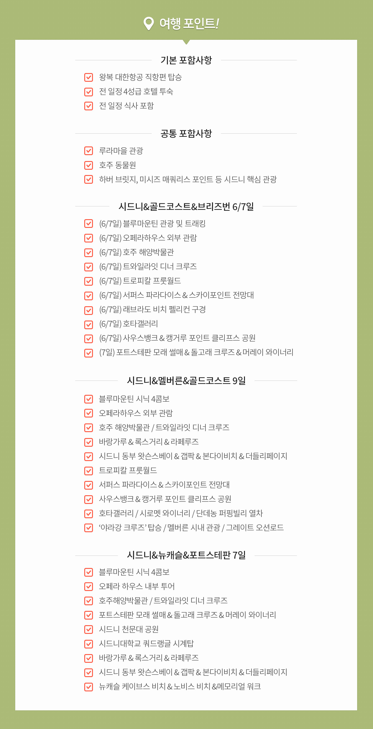 ** 시드니+골드코스트 6일 일정시 6대 특식, 시드니+뉴캐슬+포트스테판 7일 일정시 8대 특식, 시드니+멜버른+골드코스트 9일 일정시 9대 특식 제공