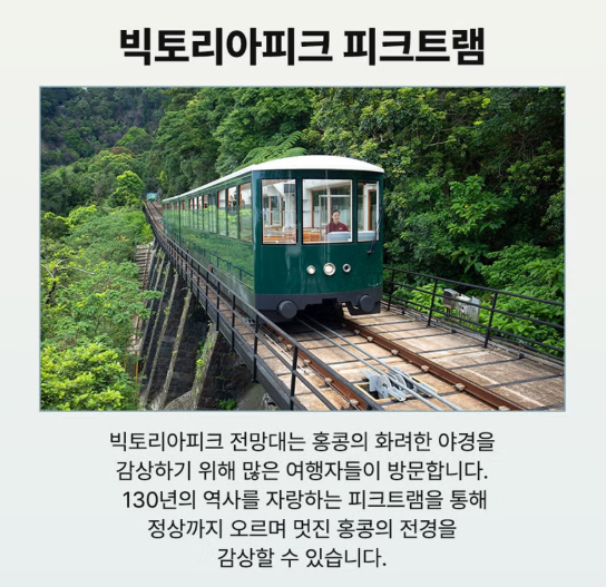 1일차: 인천공항 출발-홍콩 도착 ? 중식후- 소호거리, 미드레벨 에스컬레이터, 타이쿤 관광 ? 에그타르트 1인1개 제공 - 석식 후 ? 피크트램(편도) 탑승, 빅토리아 피크 관람 ? 호텔 투숙 및 휴식