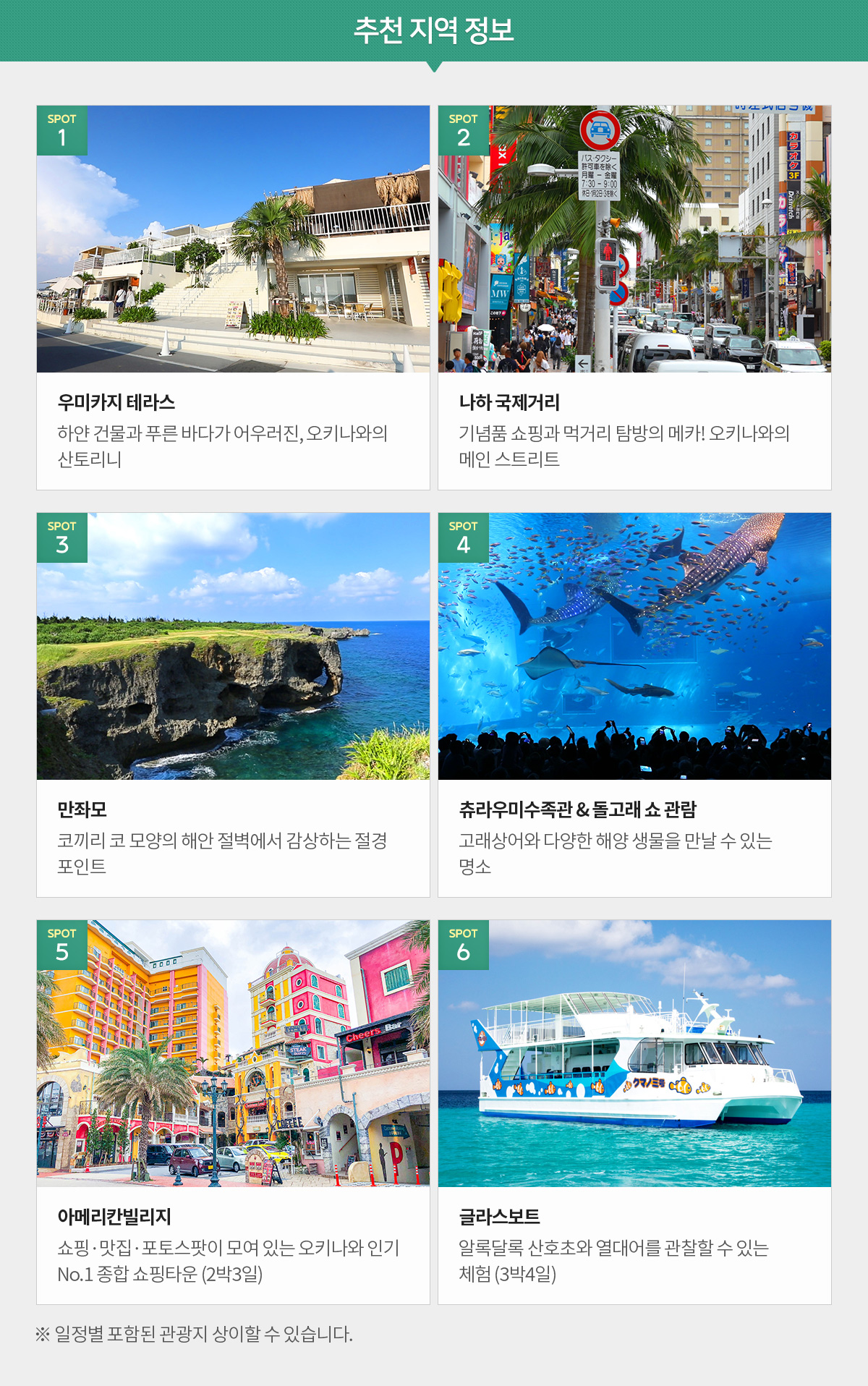 호텔 조식 후 → [관광] 만좌모 → 글라스보트 탑승(카리유시비치/탑승 불가 시 류큐무라 관광) → [관광] 비세후쿠기 가로수길, 츄라우미 해양공원 → 돌고래쇼 관람 → 호텔 이동 후 석식 및 휴식(대욕장)