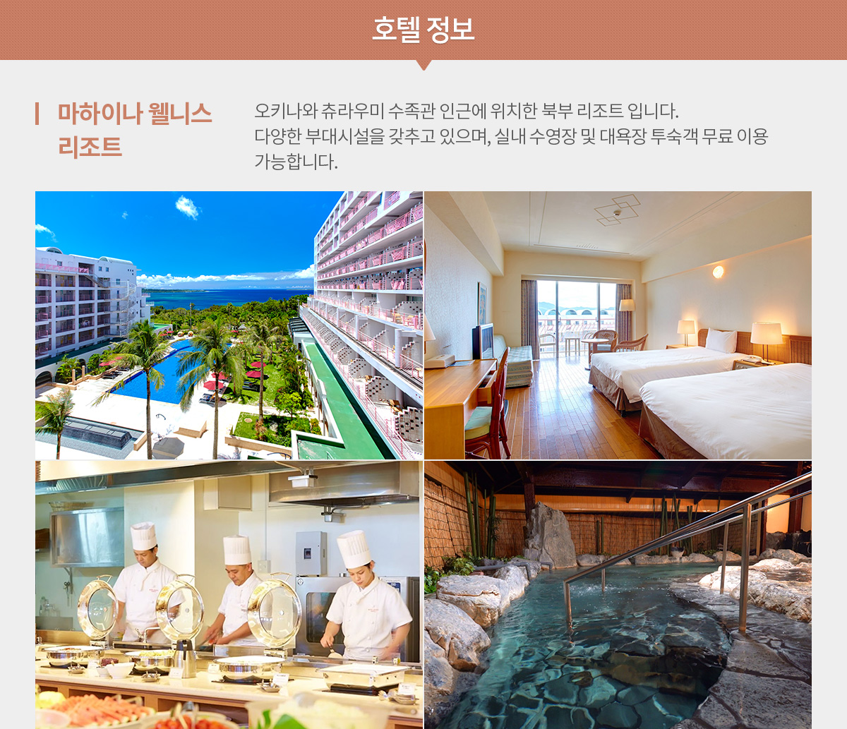 [식사] 조식: 호텔식 / 중식: 회전초밥(1인 1,400엔 지급/성인, 아동에 한함) / 석식: 마하이나 호텔 뷔페식 [숙소] 마하이나 웰니스 리조트 또는 동급