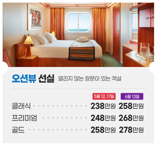 ※ 선내팁 및 출국세는 개인 선실로 청구되며, 승선 후 해외에서 사용 가능한 신용카드(VISA, MASTER)를 등록하여 결제됩니다.
