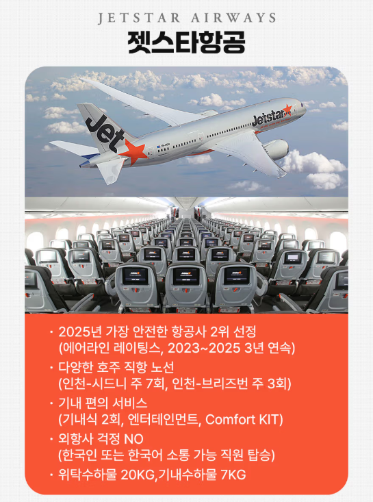 - 출발편 : 인천 출발 21:50 - 시드니 도착 10:05+1 (JQ048)