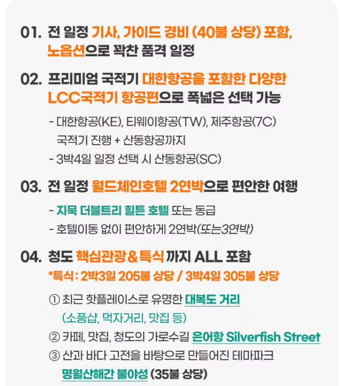 02. 프리미엄 국적기 대한항공을 포함한 다양한 LCC 국적기 항공편으로 폭넓은 선택 가능