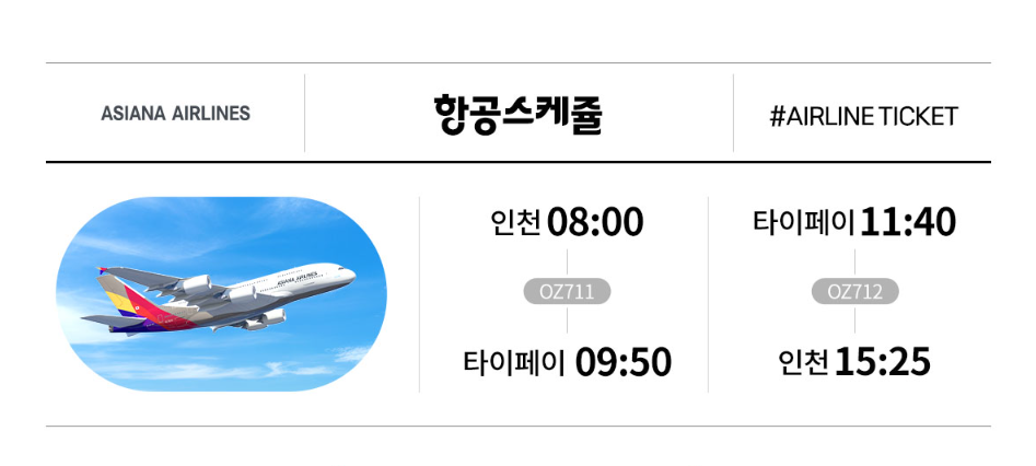 타이페이 출발 (OZ712) > 인천 도착 11:40 - 15:25