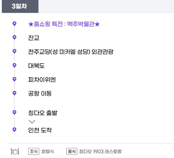 호텔 조식 - 맥주박물관 관광 (맥주시음 2잔 포함) - 잔교, 천주교당(성미카엘 성당) (외부관람), 대복도, 피차이위엔 관광 - 칭다오 공항 이동 및 출발 - 인천 도착