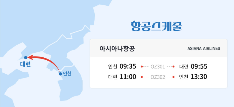 - 아시아나항공 왕복 이용 인천 - 대련 오전 출발 약 1시간 거리