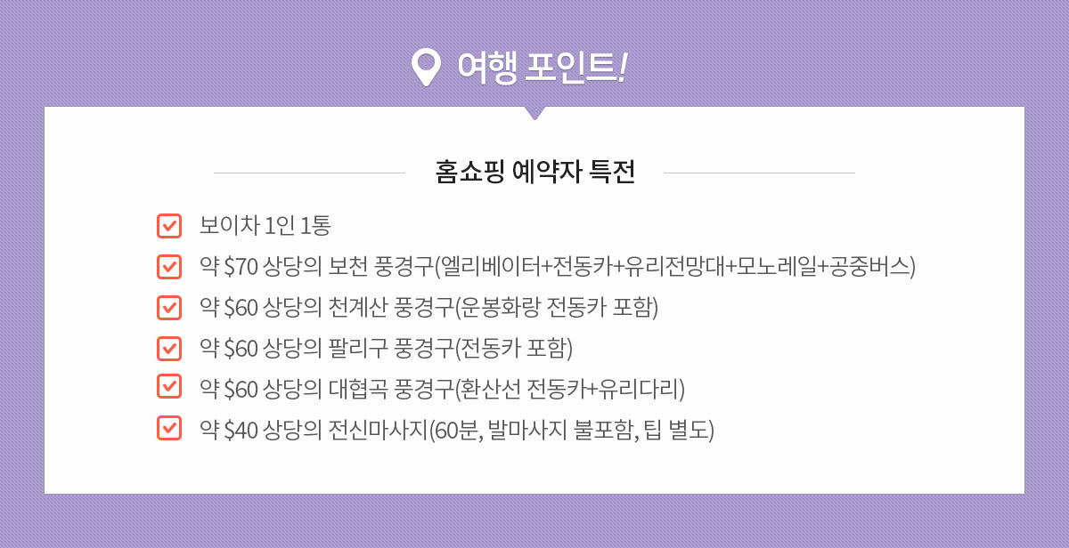 - 약 $60 상당의 천계산 풍경구(운봉화랑 전동카 포함)