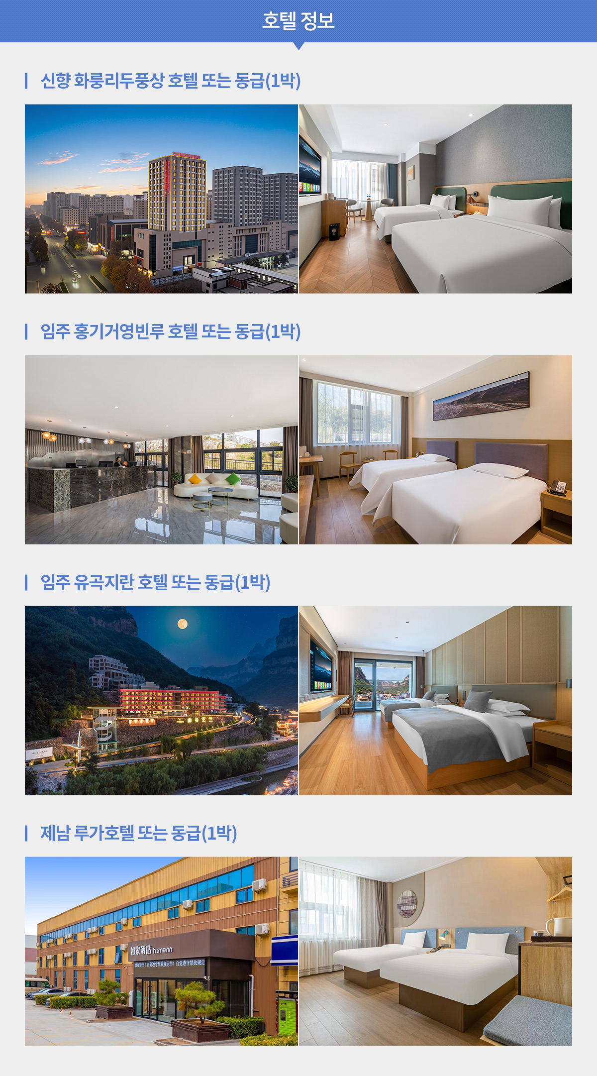 - 휘현 : 1박 / 화룽리두풍상호텔 또는 동급