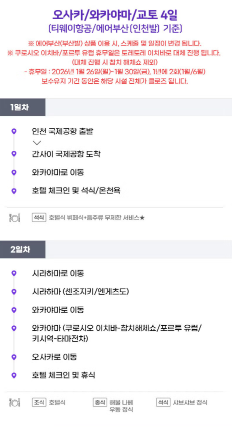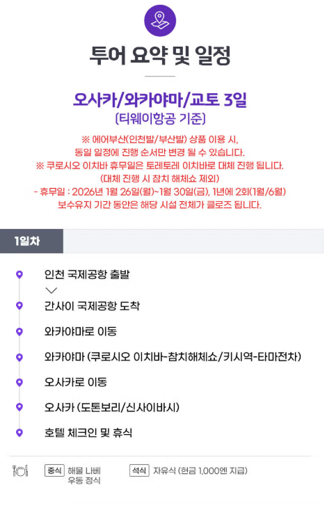 1일차 : 인천 국제 공항 출발 → 간사이 국제 공항 도착 → 와카야마로 이동 → 와카야마(쿠로시오 이치바-참치해체쇼/키시역-타마전차) → 오사카로 이동 → 오사카(도톤보리/신사이바시) → 호텔 체크인 및 휴식