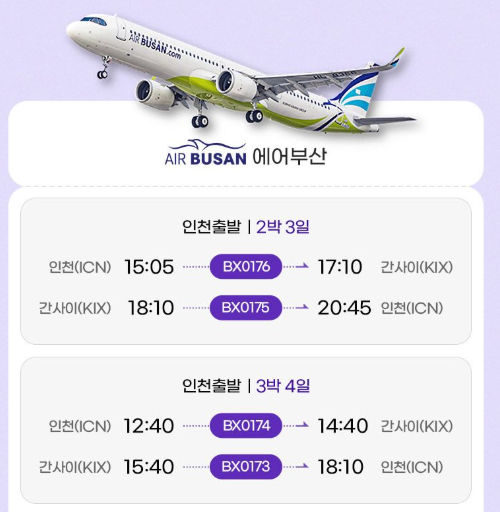 - 출발 : BX0174 인천국제공항 12:40 출발 - 간사이국제공항 14:40 도착