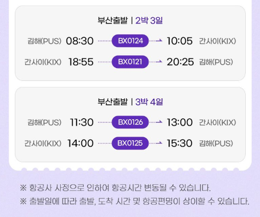 - 출발 : BX0126 김해국제공항 11:30 출발 - 간사이국제공항 13:00 도착