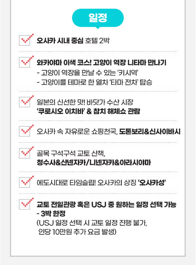 - 교토 전일관광 혹은 USJ 중 원하는 일정 선택 가능 - 3박 한정 (USJ 일정 선택 시 교토 일정 진행 불가, 인당 10만원 추가 요금 발생)