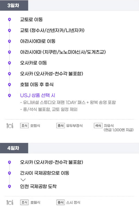 3일차 : 교토로 이동 → 교토(청수사/산넨자카/니넨자카) → 아라시야마로 이동 → 아라시야마(치쿠린/노노미야신사/도게츠교) → 오사카로 이동 → 오사카(오사카성-천수각 불포함) → 호텔 이동 후 휴식 → USJ 상품 선택 시 (유니버설 스튜디오 재팬 1DAY 패스 + 왕복 송영 포함 - 중/석식 불포함, 교토 일정 제외)