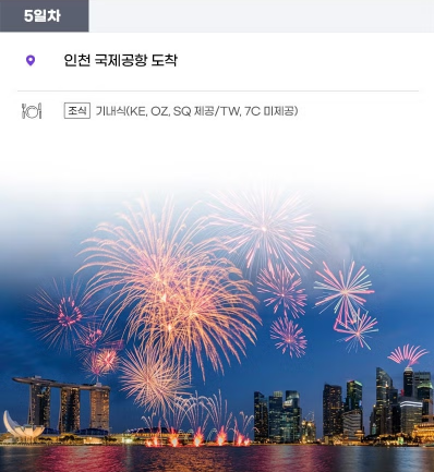 ■ 인천출발 3박5일/싱가포르항공 SQ607 인천출발 08:50 - 싱가포르도착 14:25 SQ607 싱가포르출발 00:10 - 인천도착 07:25