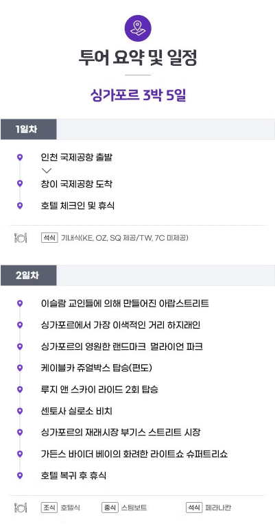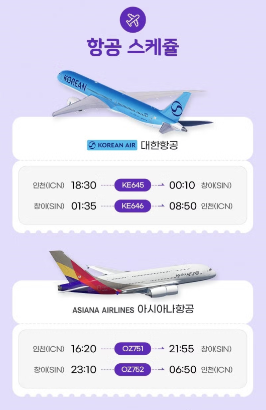 ■ 인천출발 3박5일/대한항공 KE645 인천출발 18:30 - 싱가포르도착 00:10 KE646 싱가포르출발 01:35 - 인천도착 08:50