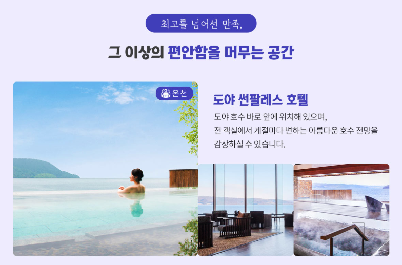 - 도야 썬팔레스 호텔 : 도야호 전경을 감상할 수 있는 온천 이용 가능한 호텔