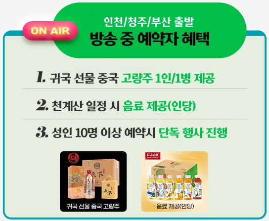 1. 귀국 선물 중국 고량주 1인/1병 제공